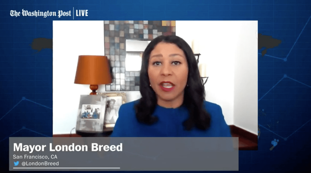 4월 23일자 워싱턴포스트와의 인터뷰 중 “4천 여개의 호텔룸을 이미 확보했다”고 대답하는 샌프란시스코 메이어 런던 브리드 시장.