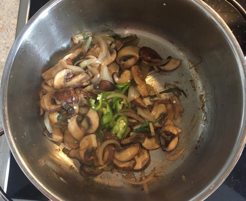 - 버섯이 반 정도 익으면 양파, 다진 마늘, 고추를 넣는다. 야채가 익으면 중-약불로 내리고 간장, 올리고당(설탕)을 넣는다. 간을 보고 간장이나 올리고당을 추가한다. (달콤짭짤한 갈비양념맛이 잘 느껴지면 성공!) 팬 바닥에 물기가 하나도 없을 정도로 완전히 익으면 불을 끈다.