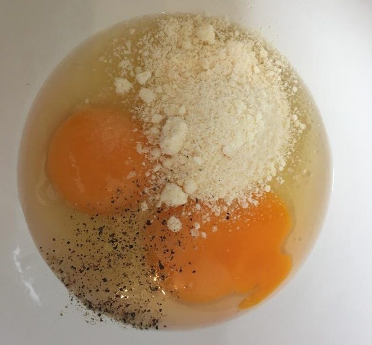 - 면이 익을 동안 까르보나라소스 준비 – 계란을 풀고 파마산 치즈가루, 소금 한 꼬집, 그라인드페퍼 한 꼬집을 넣고 잘 섞는다.