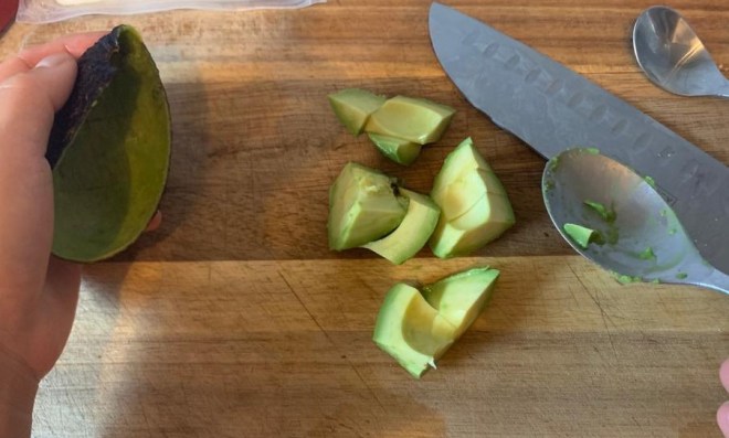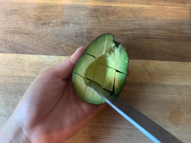 -> 씨앗을 제거한 아보카도 살은 원하는 두께로 칼집을 내고 수저로 긁듯이 발라내요.
