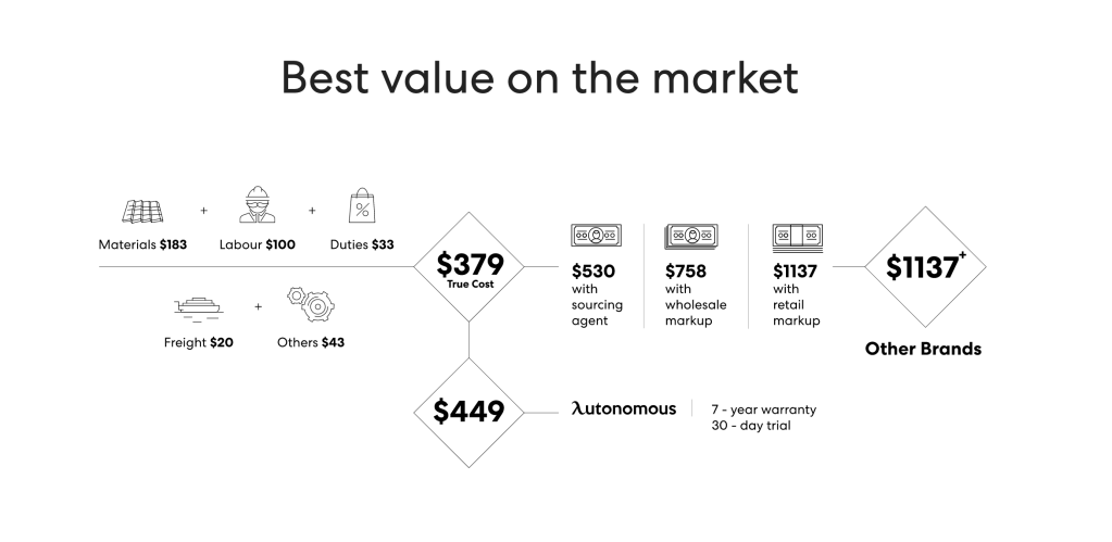 화이트, 블랙, 월넛, 화이트오크, 대나무 이렇게 5가지 컬러를 선택할 수 있고, 책상 크기도 필요에 맞게 선택하는 옵션이 있어서 공간에 딱 맞는 사이즈를 고를 수 있었다. 금액은 배송비 포함하여 $449. 가격 측면에서도 다른 모션 데스크에 비해 조금 더 저렴한 편인데 웹사이트에서 투명한 가격을 유지한다는 어필을 하며 비용분석을 과감히 드러냈다.