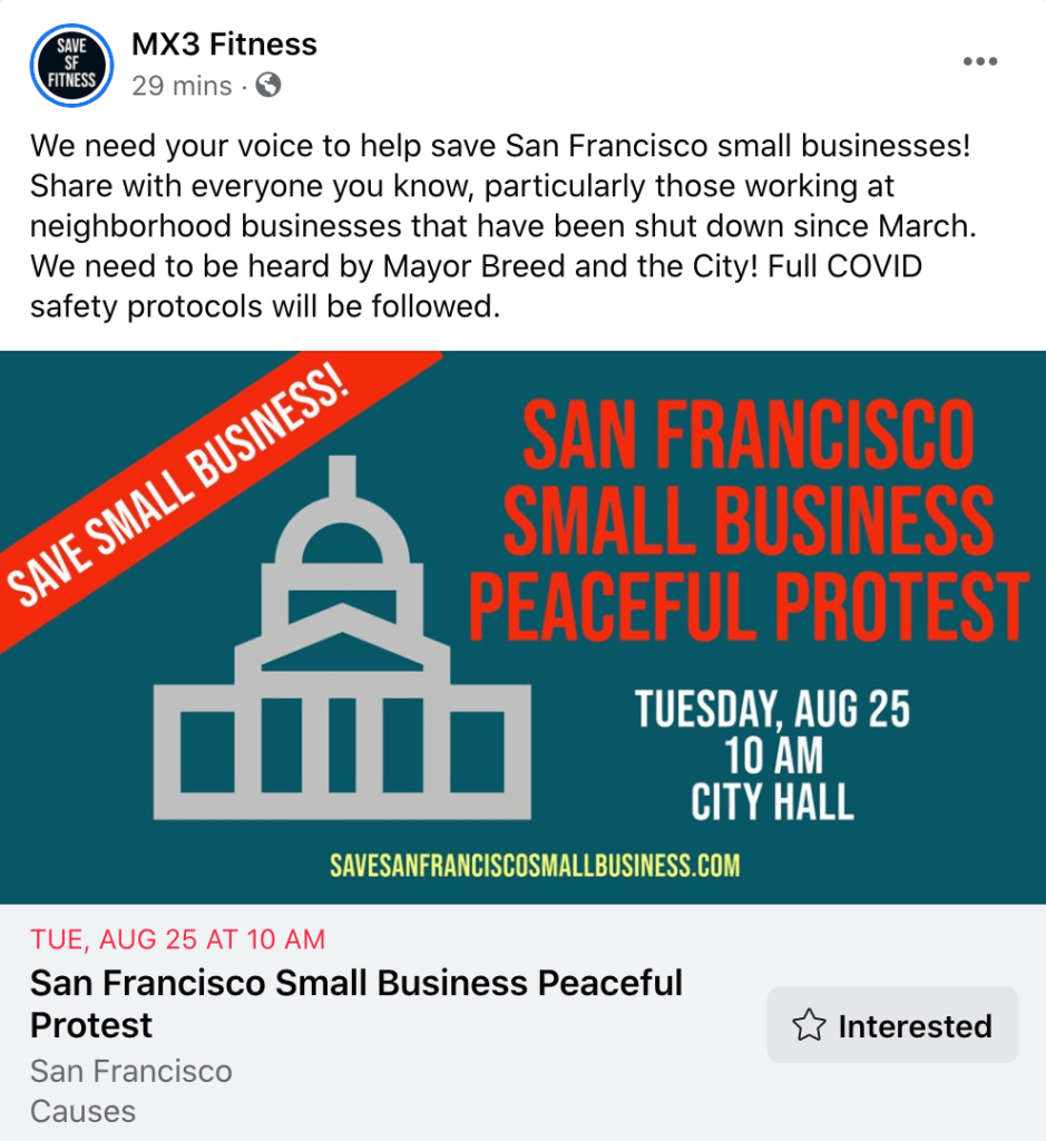 팬데믹으로 영업난을 겪고 있는 건 레스토랑 뿐만이 아니다. 샌프란시스코에는 1 제곱마일(2.6 제곱킬로미터)마다 16개의 피트니스 센터가 있을 정도로 미국 전역에서 면적 당 피트니스 센터가 가장 많이 포화 된 도시로 알려져있다. 젊은 사람들이 모여 있는 동네에 요가, 필라테스, 크로스핏 등 크고 작은 스튜디오가 줄 지어 있는 것을 볼 수 있는데 실내 활동이 전면 금지되면서 이 많은 스튜디오들도 문을 닫았다. 줌(Zoom)이나 라이브 방송을 통해서 온라인 수업을 제공하고 있지만 상가 월세와 직원의 월급을 주기 위해서는 터무니 없이 부족할 터이다.