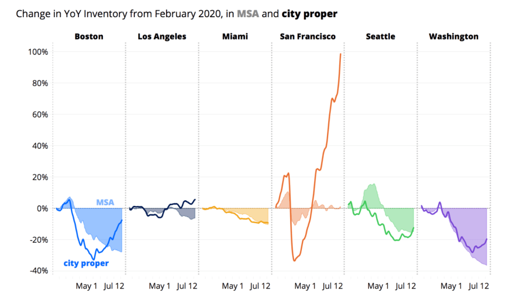 셧다운이 해제되고 영업이 재개하면 모든 게 회복될까? 얼마전 부동산 플랫폼 기업 질로우(Zillow)에서 발표한 2020 도시-교외 마켓 리포트를 보면 아직 사람들이 도시를 떠나거나 교외로 이주한 것 같지는 않다. 오히려 마이애미, 시애틀, 워싱턴 등 도시에서의 부동산 매물이 줄어들었는데, 유독 샌프란시스코에서만 부동산 매물이 급증했다. 워낙 수요보다 공급이 적었던 곳이라 그런걸까 아니면 에어비엔비로 사용하던 부동산 매물 공실율이 높아져 매물을 팔기로 한 것인지 아무튼 샌프란시스코에서 임대용 부동산 매물도 크게 늘어난 것에 비추어보면 최소한 연말 혹은 내년 여름까지는 예전의 활기를 찾을 수 없을 것 같다는 생각이 든다.