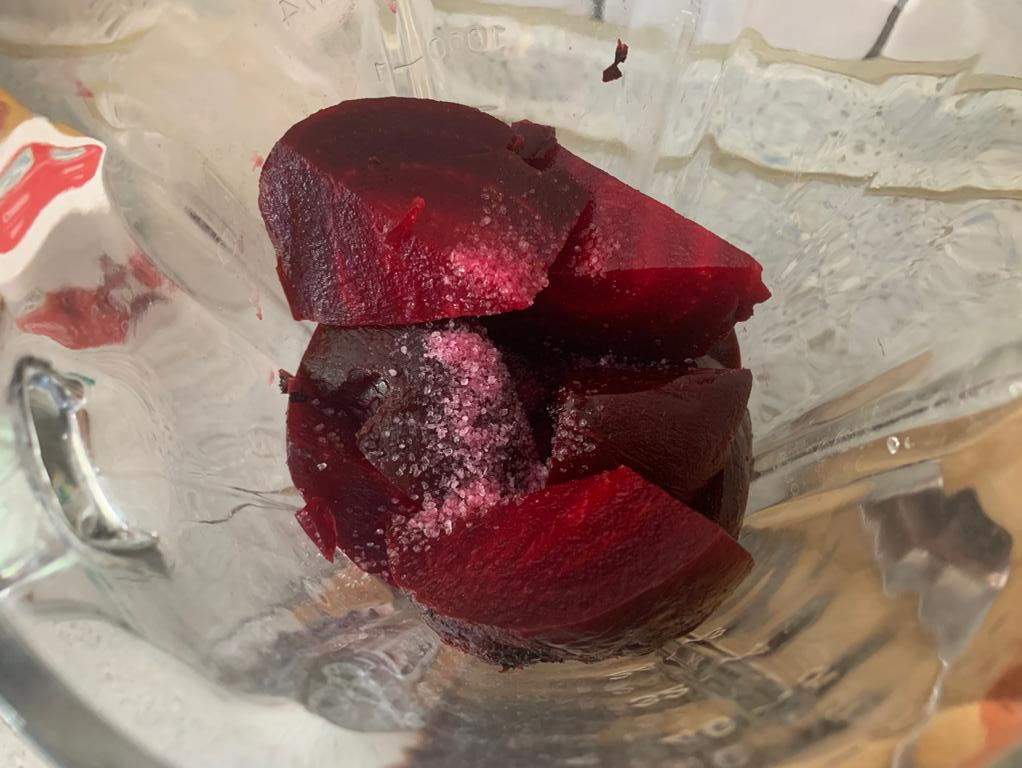 익힌 비트 500g, 홍고추 반개, 소금 1.5 티스푼, 설탕 1 티스푼, 올리브유 조금