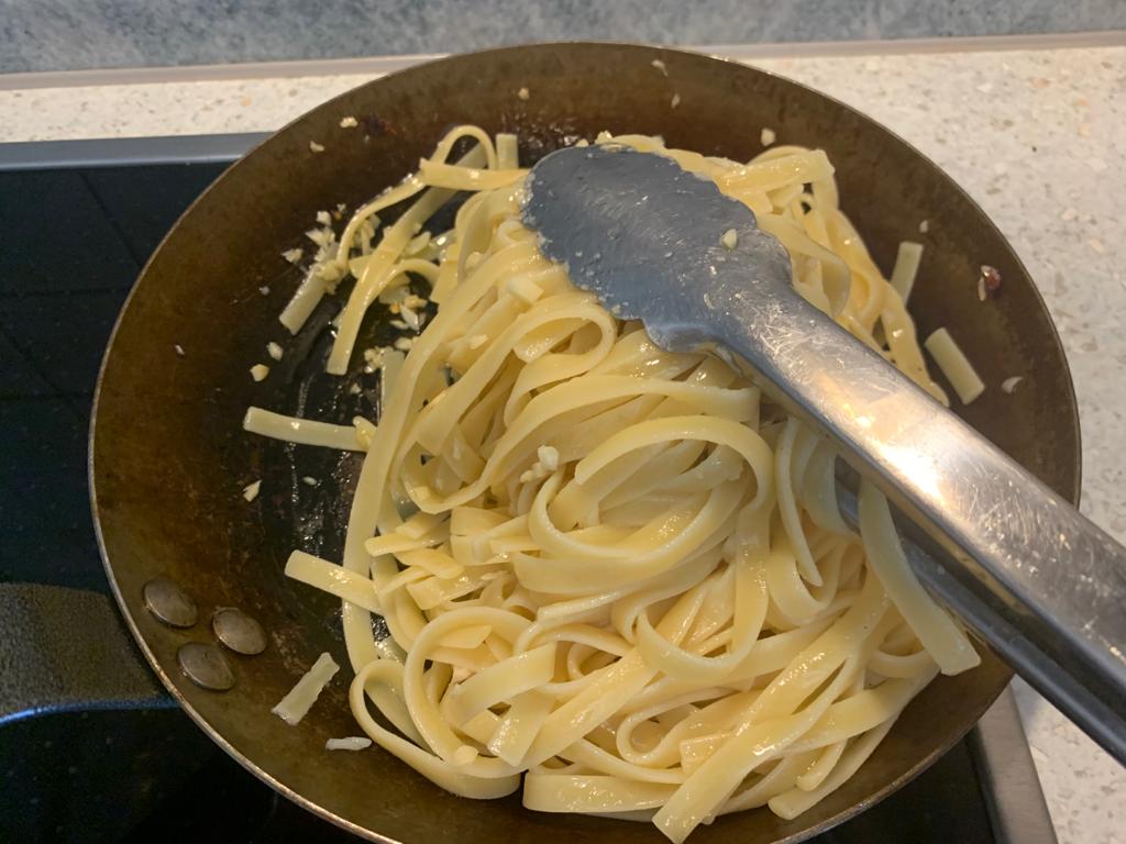 3. 알리오 올리오: 달군 팬에 올리브유를 넉넉히 두르고 잘게 다진 마늘과 마른고추를 넣어 아주 약한 불에 조리한다. (마늘이 타지 않을 만큼만 조리해주세요)