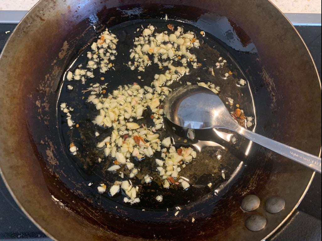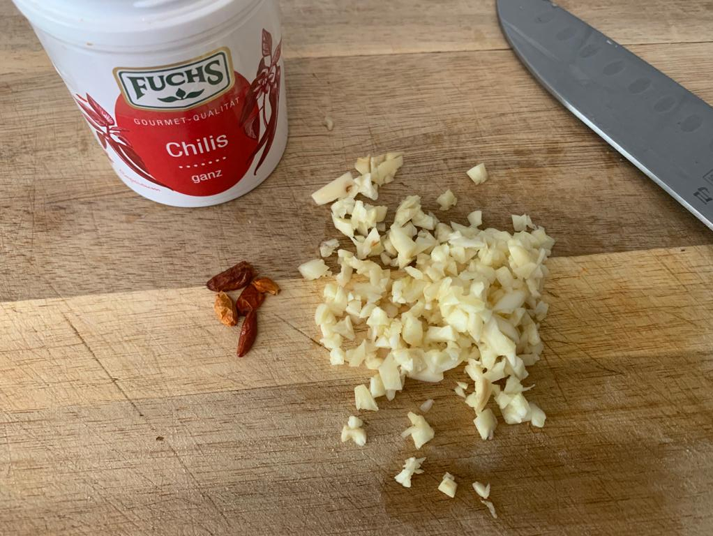 잘게 다진 마늘 약 2조각, 매운 마른 고추 조금, 올리브유 조금
