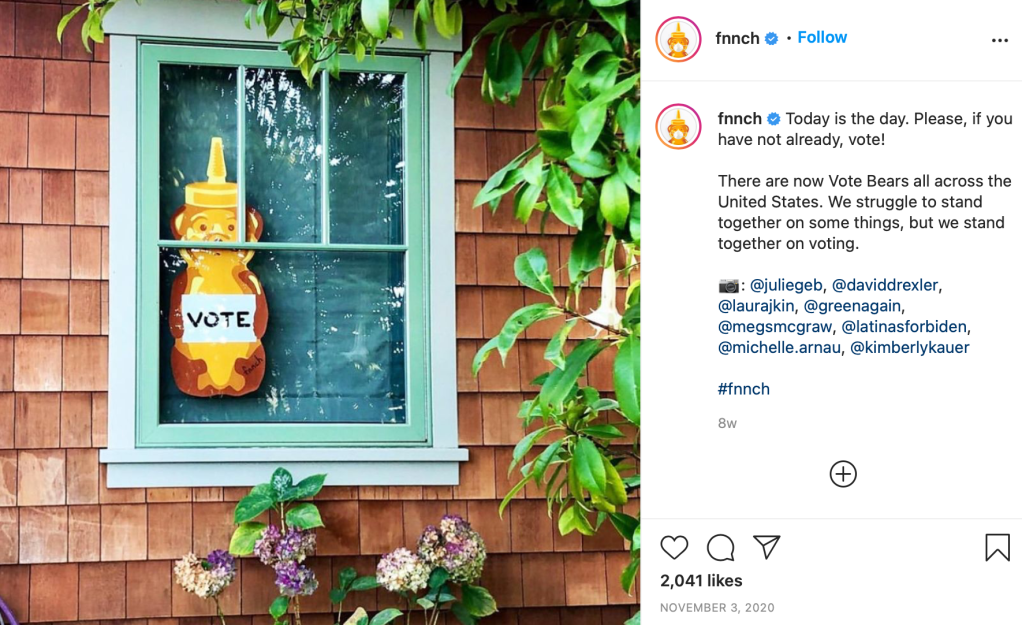 핀치의 허니베어 시리즈가 이렇게 많은 관심을 받은 이유는 뭘까? 남녀노소 대중들이 잘 아는 허니베어 캐릭터에 디테일을 살려서 사람들의 시선을 끌고 때에 맞추어 대중에게 메세지를 던진다. 예를 들면, ‘흑인들의 생명은 소중하다’ 문자가 프린트 된 옷을 입고있는 베어, 선거 기간에 배포한 vote 베어를 통해서 미국 전역에 메세지를 전했다. 모든 시민에게 주어진 한 표를 통해서 사회를 바꿔보자고. 백 마디 말보다 이미지 한 장으로 사람들의 마음을 움직였던 것이 원인이 아닐까 생각해 본다. 한 인터뷰에서 작가는 허니베어가 전 세계인이 공감하는 행복의 상징(the universal symbol of happiness)이라 생각한다고 영감이 된 소재를 설명했다.