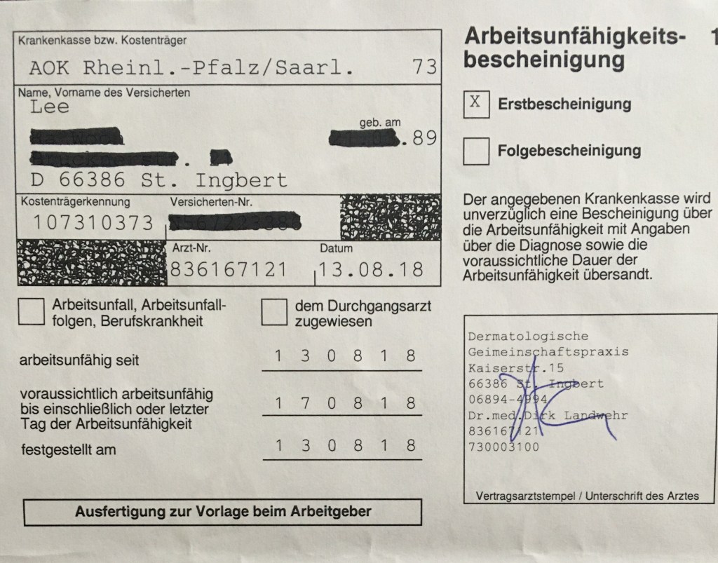독일에 온지 2년 차가 되었을 때다. 오랜만에 시작한 직장 생활에 잘 안 되는 독일어, 생소한 분야 등의 어려움이 겹쳐 일을 시작한 지 얼마 되지도 않아 아토피가 도졌다. 내가 눈두덩이와 광대가 벌겋게 부은 채로 계속 출근하자 상사가 먼저 나서서 병가를 제안했다. 그는 내가 독일 법규를 잘 모를거라 짐작했는지 3일까지는 의사 처방 없이도 쉴 수 있다는 팁을 넌지시 주기도 했다.