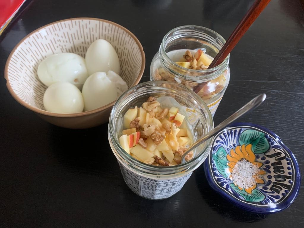 그리하여, 우선 점심의 양을 늘리기로 한다. 치아 푸딩에 오트밀도 조금 섞고, 호두도 부셔 넣고, 단 거 좋아하는 띤군한테는 꿀도 한 스푼 타 준다. 거기에 삶은 계란을 인당 2개씩 추가하니, 먹고 나면 위가 은근 묵직한 것이 꽤 배가 차는 느낌이다.