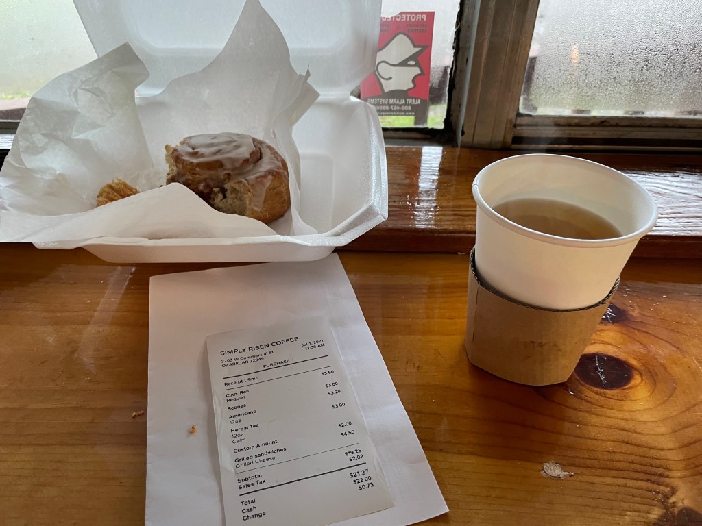 오클라호마시티에서 내쉬빌로 가는 길. <Ozark> 미드에서 소개 된 것과 같이 마을 입구부터 깊은 산 속에 들어온 기분이다. 고요한 동네에 보슬보슬 비가 오니 더 운치있었던 드라이브. 꾸불꾸불한 숲 속 드라이브 중 (사막 속 오아시스를 발견 한 듯!) 작은 오두막 까페를 찾았다. 허기에 진 우리의 배를 채워줬던 따뜻한 티와 시나몬 브레드.