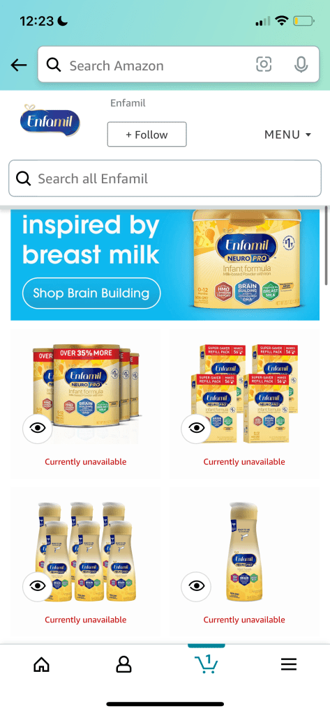 설마했던 일이 일어났다. 올해 2월부터 분유 코너에 재고가 점점 줄어들더니 이제는 특정 브랜드 제품은 솔드아웃 된 지가 꽤 됐다. 재작년 팬데믹 때 사람들이 식료품을 사재기하던 모습이 재현되는 듯하다. 지인들과 분유를 구했냐는 문자를 주고받고, 사람들이 분유 사재기를 하는 바람에 직접 마트에 가서 ID 를 보여주고 픽업해야 하는 상황이 벌어졌다. 재고가 있다는 마트를 찾아 왕복 한시간 반을 운전해서 분유 두 통을 사러 다녀온 적도 있었다. 최대 2주치 먹일 분유를 공수해오면서 다음 달을 걱정하는 상황을 겪은 지 벌써 세 달째…