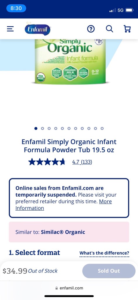 그래도 간간이 우리가 쓰고 있는 제품은 재고가 하나씩 떠서 다행이다 싶었는데, 이틀 전에 Enfamil 공식사이트에서 주문한 분유 택배를 도난 당하면서 상황이 달라졌다. 공교롭게도 그 날 엔파밀 업체가 더이상 공식홈페이지를 통해 주문을 받지 않는다고 공지한 시점이었고, 집에는 이틀 치 먹일 분유가 남아있는 상황이라 다급해졌다. 뉴스를 검색해보니 사람들이 대량 사재기를 한 후 인터넷에서 2-3배 높은 가격에 파는 일이 생기면서 정부가 개입하게 됐다고 한다. 한국에서도 분유 대란 뉴스를 보도하고 있다. 그제서야 느긋하게 있던 남편도 마음이 급해져 집 앞 코스트코에 다녀오겠다며 분유를 구하러 갔다. 아니나다를까 코스트코도 얼마전까지 재고가 있었는데 오늘 가보니 텅 비었단다. (현재 토들러 분유만 재고가 남아있는 상황)